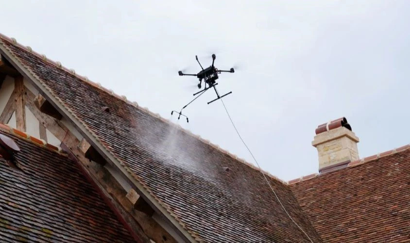Le drone est raccordé par un tuyau, lui-même connecté à une cuve reliée à une pompe. Cette pompe envoie le produit biologique jusqu’à la buse fixée sur le drone, qui pulvérise ensuite le produit sur la toiture.